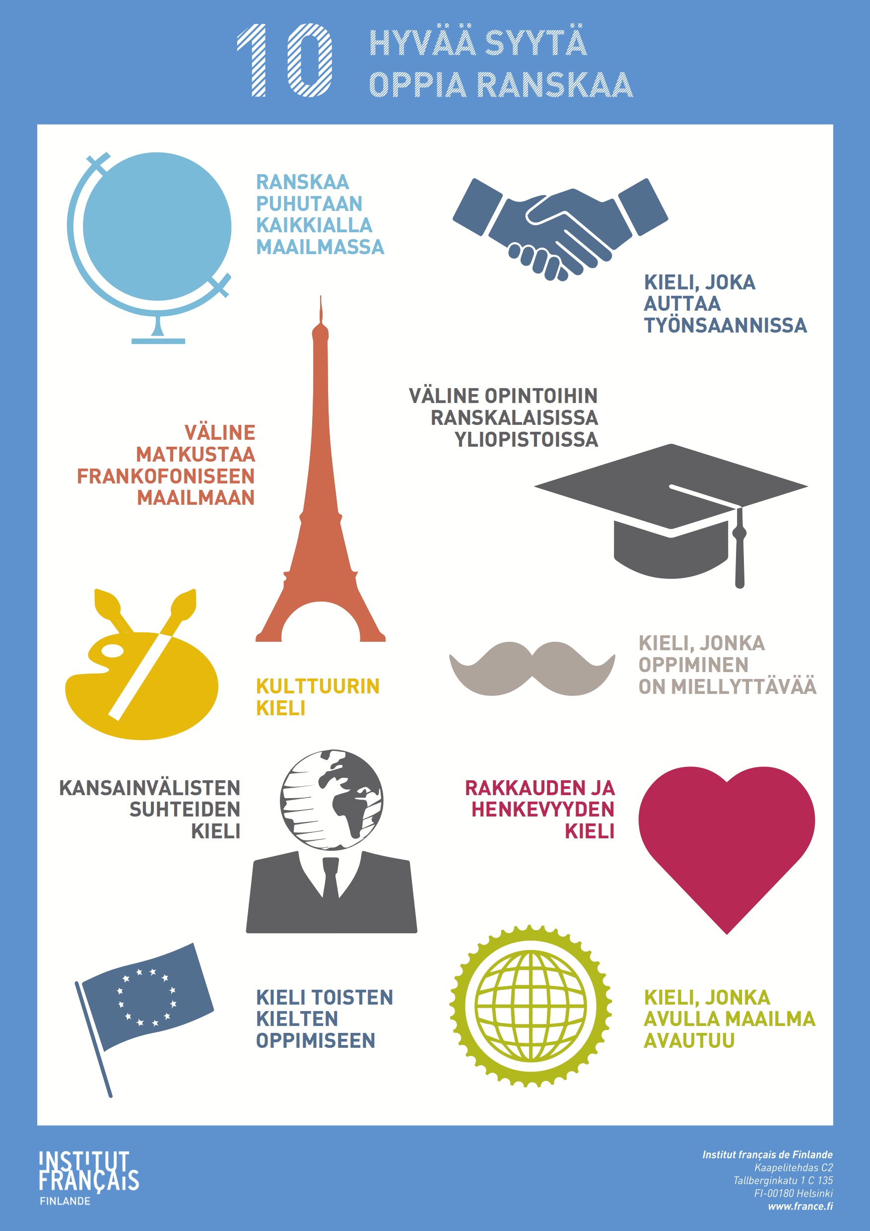 En 2015 les 10 raisons pour apprendre le français ont été imprimées sous forme d’affiche réalisée pour l’association des professeurs de français par l’Institut