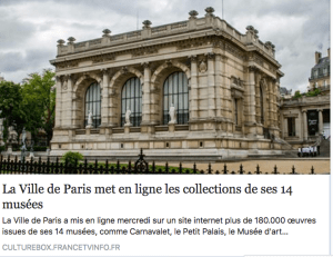 La Ville de Paris a mis en ligne sur un site internet plus de 180.000 œuvres issues de ses 14 musées, comme Carnavalet, le Petit Palais, le Musée d’art moderne ou la Maison de Victor Hugo… avec un accès gratuit. (cliquer sur l’image ci-dessous)